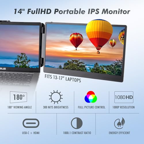 Designed for laptops with fully-featured USB-C ports, our portable monitor connects effortlessly with a single cable for each screen. If you have limited ports, use the included USB-C to HDMI cable for a hassle-free experience. Enjoy crystal-clear visuals on the 14" Full HD IPS display, boasting 300 nits brightness, anti-glare protection, dual audio speakers, and customizable picture settings.